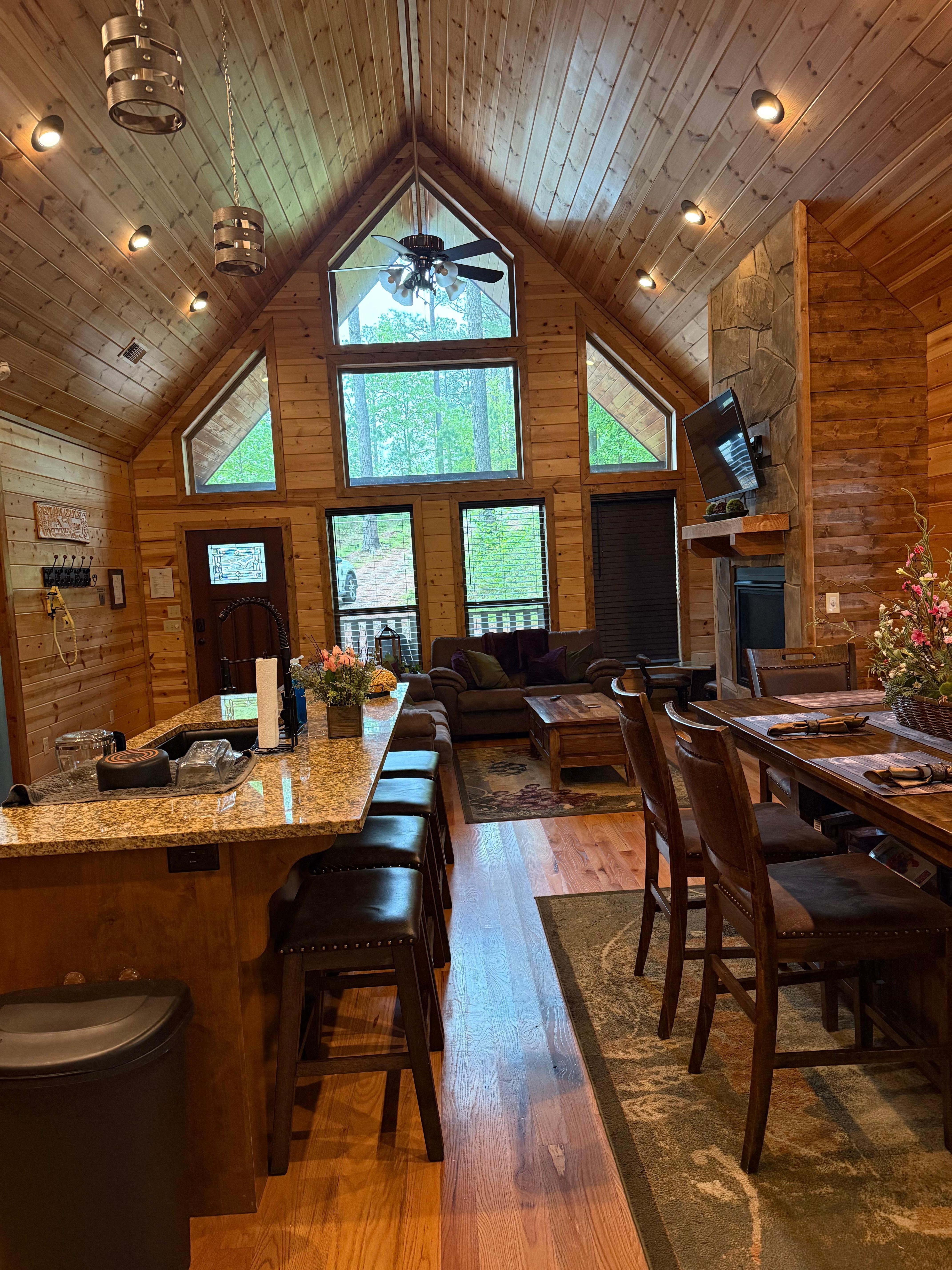 GOTANYGRAPES cabin is the ultimate destination in Broken Bow. This luxury cabin nests on 1.4 acres of land and offers a peaceful, quiet, secluded setting perfect for romantic couples getaways, friends retreats, special birthday or anniversary celebrations, girls trips, small family vacations or even remote work escapes. Conveniently located in heart of Hochatown with easy access, just minutes away from all the attractions including the beautiful Broken Bow Lake, Beavers Bend State Park, Choctaw Landing Casino, and all the restaurants, shops and fun activities (walking distance to Sasquatch Candy Den/ice cream shop, BBQ restaurant, Cave and souvenir shop).