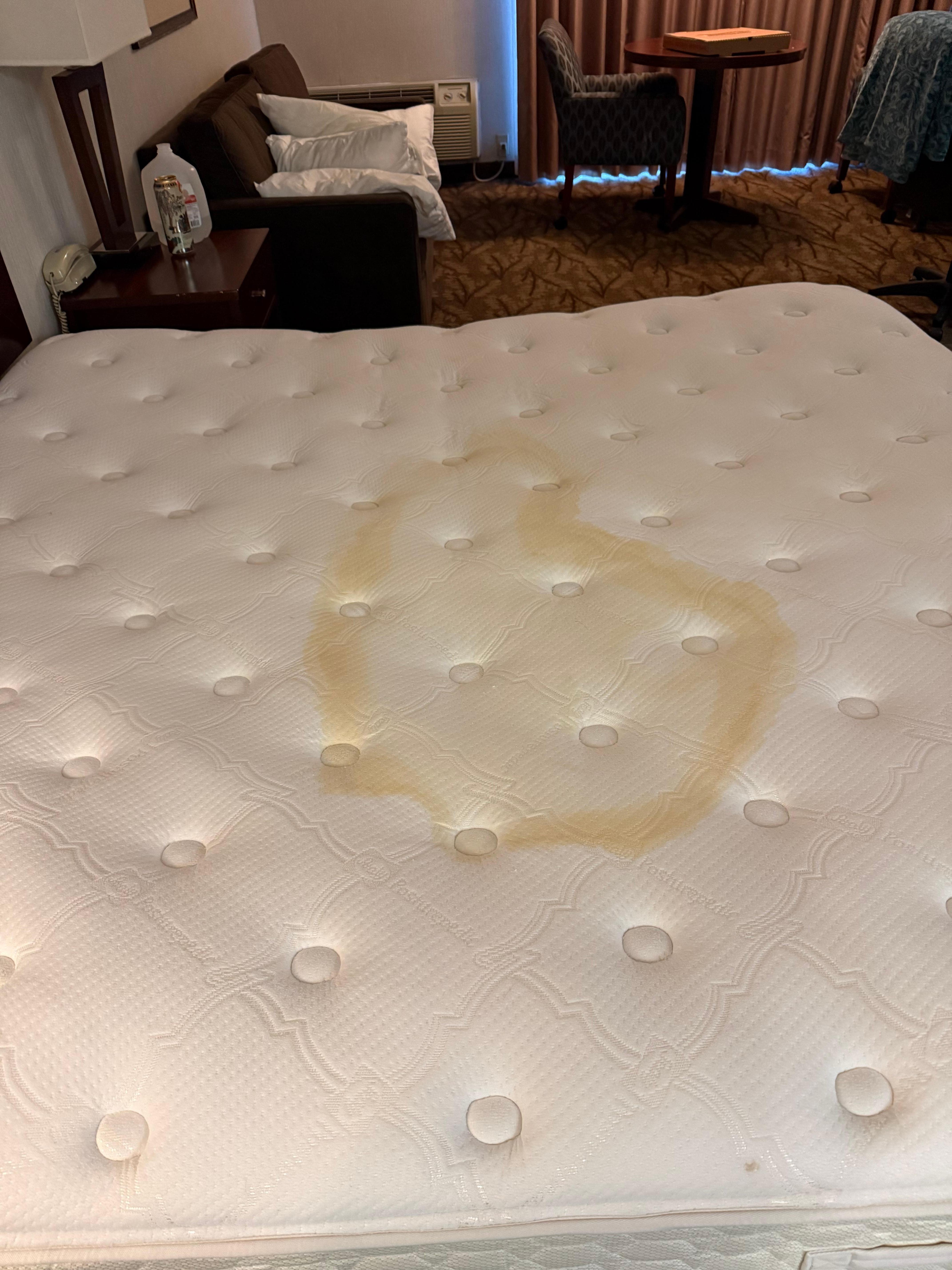 I again reported the urine-stained sheets and dirty shower and asked to be moved to a clean room. That request was bypassed. The front desk agent offered to clean the shower himself and provide a new fitted sheet, stating he did not know how to make the bed. I told him not to worry about putting the sheet on, just to drop it off when he cleaned the bathtub. By 11:30 pm, the shower was still dirty, though the sheet was waiting at the front desk when we asked.