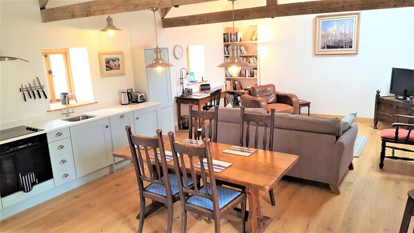 Stallen har originale hvelvede bjelker med eikegulv, og har et stort åpent kjøkken / stue og spisestue. En virkelig perfekt kamp av ny og gammel. Den er lys og romslig. Det er et stort velutstyrt kjøkken med dobbel stekeovn, elektrisk komfyr, mikrobølgeovn, vaskemaskin og oppvaskmaskin