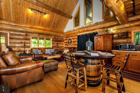 From the living room, you will find log stairs to the oversized loft with a queen bedroom and full bath and a second living area with a smart TV overlooking the open concept below.