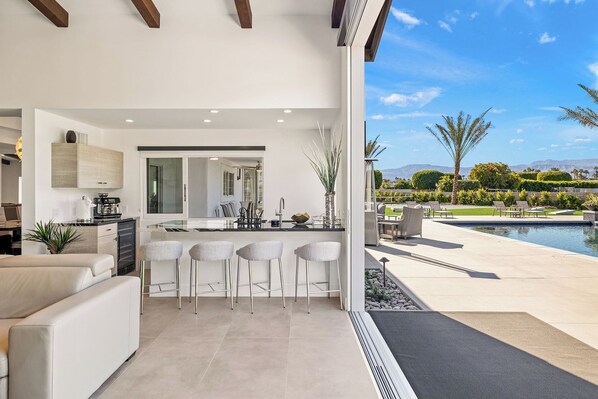The open concept floorplan has over 4200 square feet to kick back and relax with your group. The great room has comfortable seating and looks out to the pool yard. The gourmet kitchen features high end appliances, gas range, double ovens, and ample counter space. Indoor dining seating for 28 - at the oversized island with 6 seats, second island for 6, kitchen table for 4, and formal dining room for 8. Fabulous bar with prep island and sink, wine fridge and seating for 4. Media room with seating and a TV.