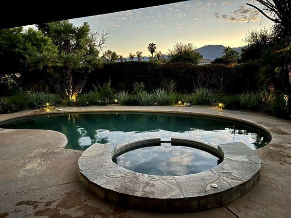 Fantastisk innendørs / utendørs levende i en avslappet 3 soverom (4 seng), 2 bad hus med en nydelig, privat bakgård, bougainvillea overbygd terrasse m / grill, blomsterhager, basseng og boblebad, og utsikt over Santa Rosa Mountains i avstand. Enten å våkne opp til fuglens kor i trær, roadrunners som strekker seg over gressplenen, lys sol og himmel, eller går og sover til å kvitte seg med crickets og stjernene flammende overhead, er dette et rolig lite sted.