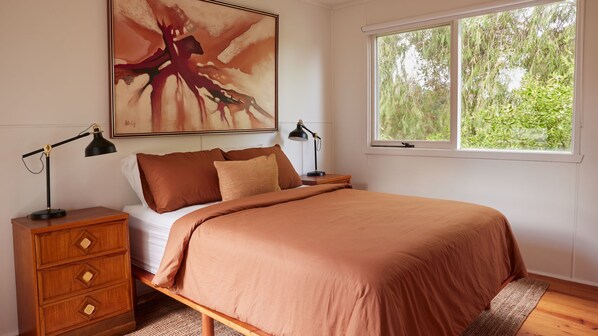 Bedroom 1 boasts a queen bed and a private ensuite with shower, toilet, and vanity.