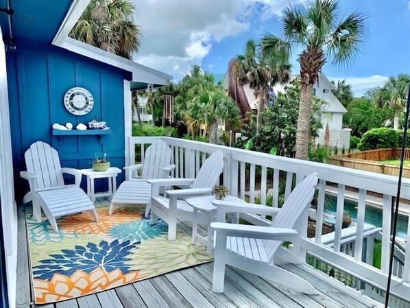 The charming deck overlooks the yard and pool. Take a seat in one of the Adirondack chairs, or travel down the stairs to the spacious yard, which features a pool deck and poolside seating with a table, sun loungers, and Adirondack chairs. Down here you'll find an outdoor beach shower and a full-size fridge.