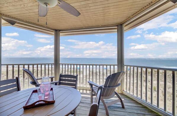 Panoramic views of the ocean, surf, beach, and dunes in a comfortable and charming one bedroom condominium featuring both a screen porch and roof top deck.