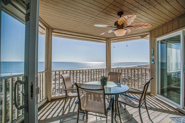 This third-floor condo boasts ocean views from every room. Both the living room and bedroom have direct access to the screened porch. Guests can also enjoy the panoramic ocean views from the widow's walk deck. This is a beautiful end condo with an updated kitchen featuring new, sparkling stainless steel appliances with a new refrigerator and upgraded quartz countertops. The new washing machine and dryer add even more convenience to your vacation home. Additional upgrades include a brand new air-conditioning unit that will keep everyone cool indoors. On days in, relax on comfortable furnishings in the living space and watch your shows on the upgraded TV. Surely, you'll enjoy your stay here.
