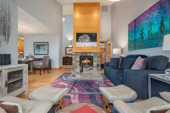 Gjestene vil nyte noen av de beste fjellutsiktene som er tilgjengelige i Cove-området i Aspens. Dette fargerike, profesjonelt innredet hotellet tilbyr praktisk ett nivå leve med tre soverom og 2 bad. Eiendommen har en åpen planløsning med stor takhøyde og store vinduer mot Tetons. Om sommeren kan du slappe av på den store ryggen dekket mens du beundrer uforstyrret utsikt over fjellene. Om vinteren kan du varme opp foran den store steinen peisen etter en dag i bakken. Kjøkkenet har blitt oppdatert med nye hvitevarer og granitt benkeplater som åpner til spisestue med plass til 6 komfortabelt.
