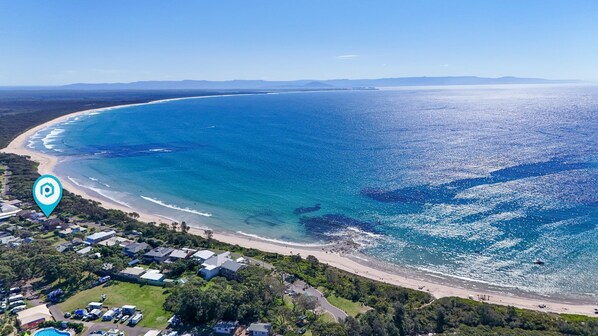 Tenk deg å bo rett overfor den gylne sanden på en av sørkystens fineste strender. Hvor du kan sitte på terrassen og nyte utsikten over vannet eller bare hoppe over veien, og i løpet av en to minutters spasertur, bade, boogie boarding eller bare flyte under blå himmel i vann som krystallklart som en fjellstrøm. Der kan din firbeinte venn løpe kilometer, og barna kan plaske i bølgene mens foreldrene slapper av.