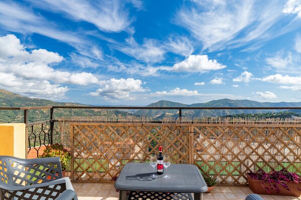 Double room with private bathroom, ideal for accommodating up to 2 people. The room is equipped with air conditioning, TV, and offers a panoramic terrace where you can enjoy a splendid view of the mountains and the sea. Breakfast is included in your stay. The environment is welcoming and designed to ensure comfort and relaxation during your stay. Perfect for those seeking a quiet and scenic accommodation.