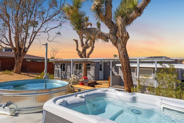 Grill up a meal under your own Joshua Tree with the gas grill (fully connected and always ready to go) right off the back patio; or take a dip in the cowboy pool or hot tub and melt the day away. At night, you can turn down the lights for the star-studded sky this desert is so well know for; or light up the fire pit for some cuddles and conversation. All in all, every inch is a memory in the making.