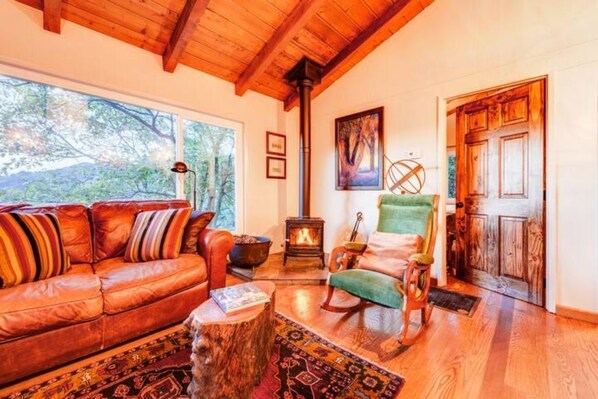 Our two-bedroom one bath 600 square foot cabin feels larger than it is because of the high ceilings, large picture windows, and expansive views. It will sleep four adults and two children, but it is best with just one couple, or a couple with a child.