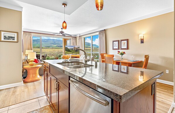 One of the absolute best values available at Honua Kai, Hokulani 822 is a luxurious 2BR/2BA suite offering panoramic views of the lush West Maui Mountains from its fantastic 8th-floor corner location. You can even catch glimpses of the tranquil blue Pacific in the distance while lounging on your large private lanai.