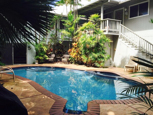Denne romantiske villaen ligger på en privat strandbane, på en privat eiendom som heter Kailua Gardens. Du kom inn i villaen gjennom den skyve glassdøren i den grunne enden av bassenget.