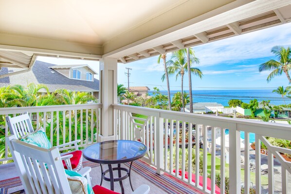 Greet each morning with a gorgeous view of the Pacific Ocean, swaying palms, and the community pool just below at this incredibly spacious, light-filled condo near the heart of Kailua-Kona.