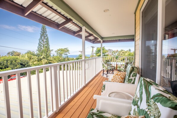 You’ll have the entire private upper level to yourself — complete with ocean views, cooling tropical breezes, and a spacious covered lanai.