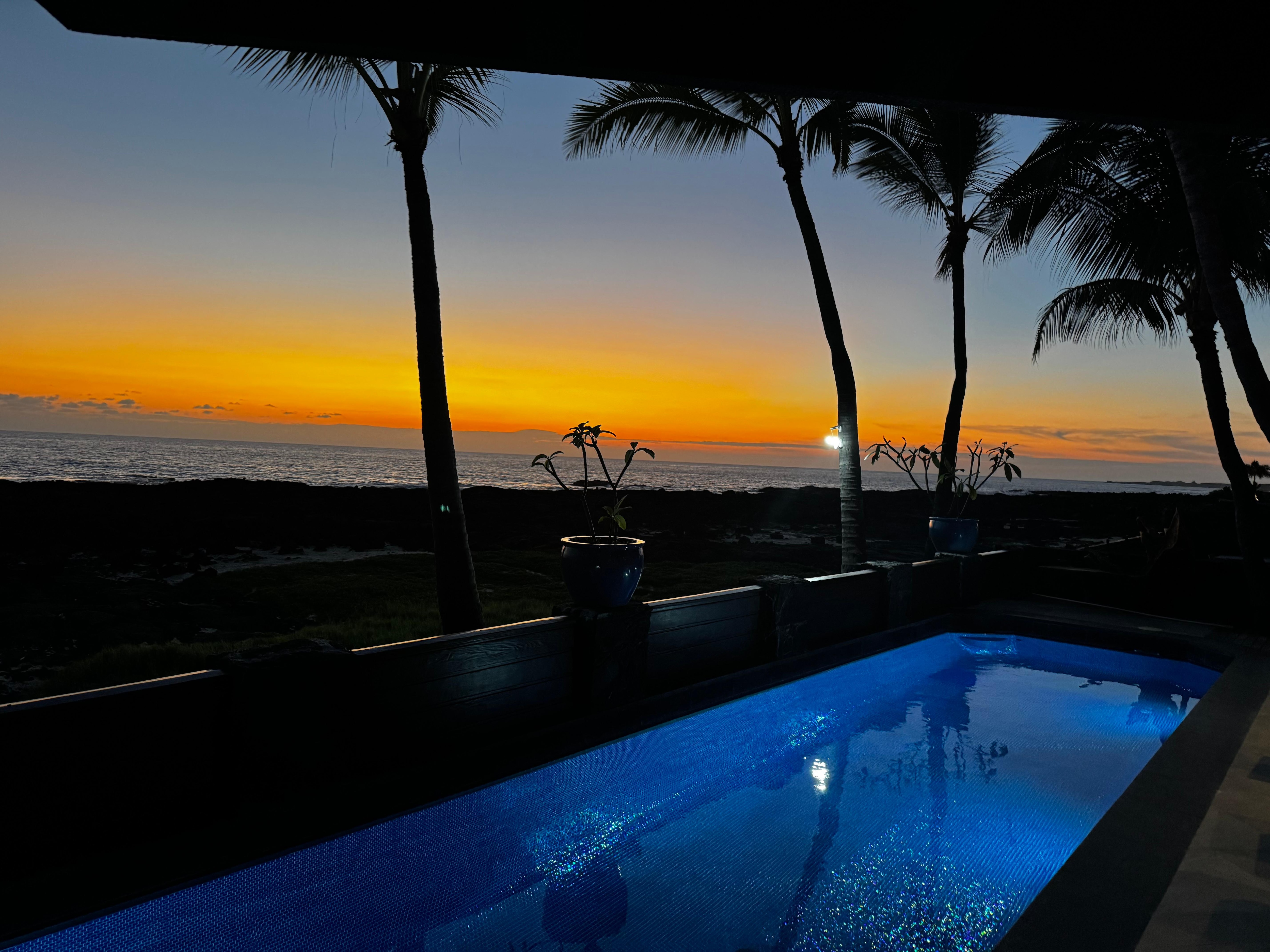 Step outside to the expansive lanai with all new anti slip tile and revel in panoramic ocean views and spectacular sunsets, surrounded by lush landscaping and towering palm trees. Witness nature's wonders firsthand, from breaching whales and playful dolphins to gentle sea turtles, all from the comfort of your own private paradise. Enjoy the 50' wide brand new iridescent glass tile pool that shimmers as soak up the Kona sun.
