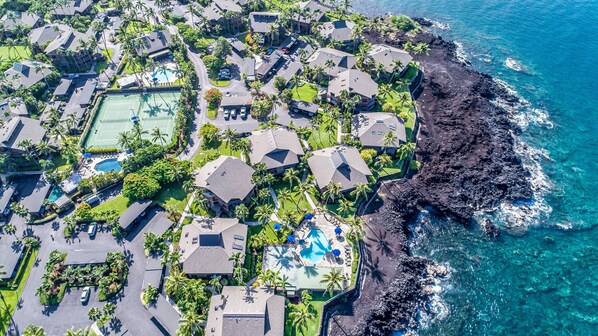 Denne enheten har to store soverom med to bad. Et fullt utstyrt kjøkken med alt du trenger for en perfekt ferie. Det er tre private lanaier. Lanai off av det romslige familierommet har utsikt over golfbanen. Lanai utenfor det første soverommet har utsikt over havet og svømmebassenget, og Lanai utenfor det andre soverommet har nydelig havutsikt. Enheten inkluderer klimaanlegg, kabel og wifi. Enheten er dekorert med vakker hawaiisk dekor og takvifter overalt. Dette er de perfekte omgivelsene for å oppleve alt Big Island har å tilby. Denne enheten ligger i andre etasje, og det er bare trapper for å få tilgang til den.