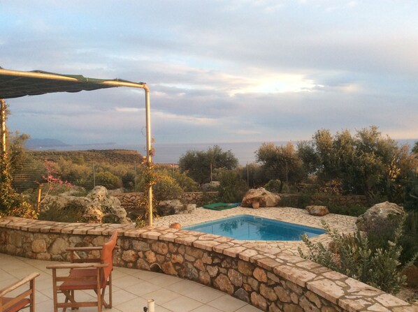 På kanten av en olivenlund, med 360 graders utsikt over fjell og sjø fra sitt eget "Manitårn" ble villaen bygget i 2011 ved hjelp av stein hentet fra sitt eget land. Alle dører åpner mot en stor terrasse og en nydelig hage i sympati med det naturlige miljøet: bergarter og oliventrær som produserer den berømte Mani olivenolje, fiken, granateple, sitron, oransje og kvede og den evige lukten av lavendel og rosmarin.