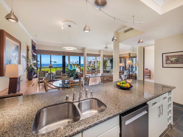 C202 boasts a fully-equipped kitchen, perfect for culinary enthusiasts. The open-concept living and dining areas open to the spacious lanai, allowing you to enjoy incredible indoor-outdoor living year-round.