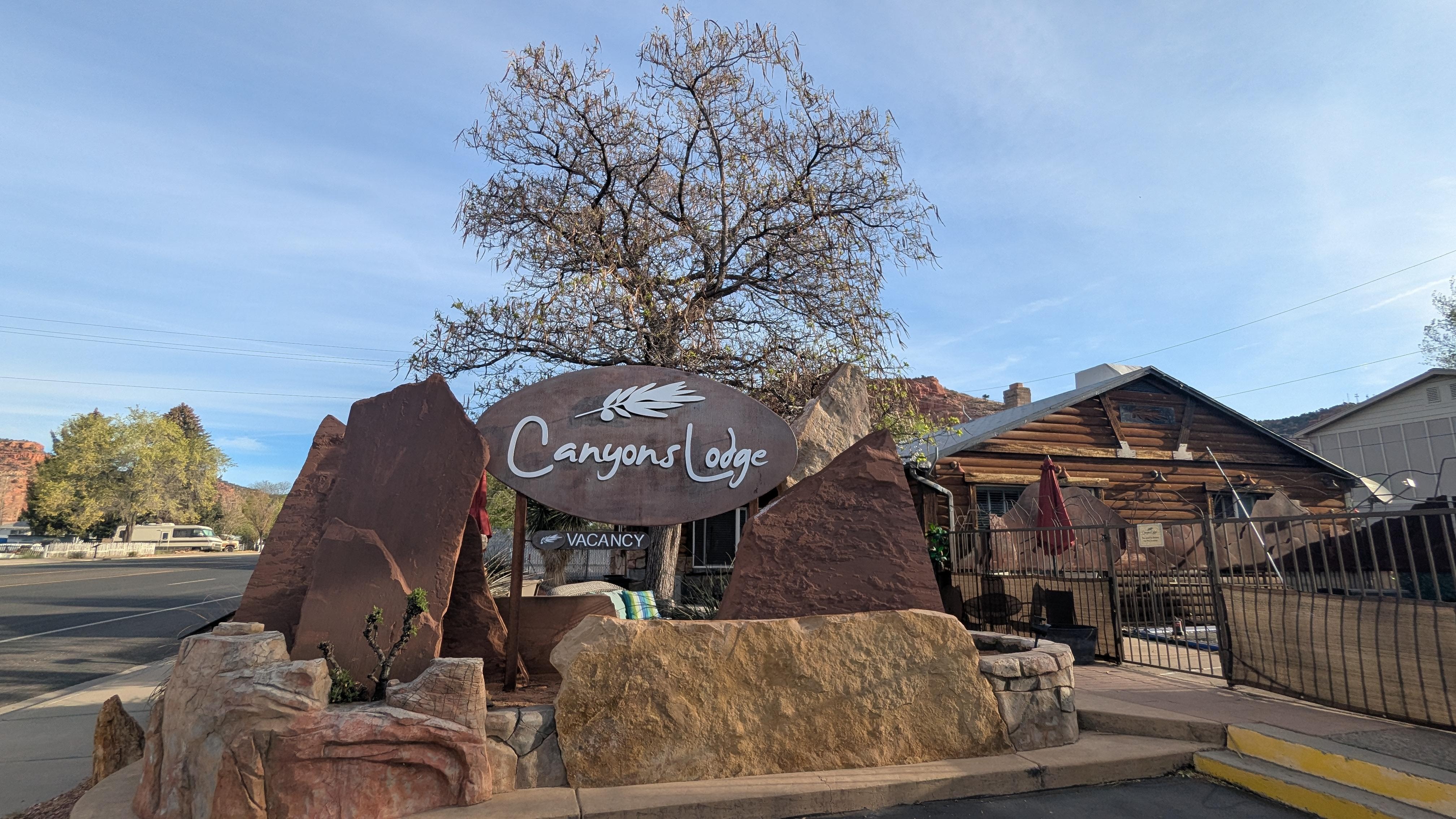 A gem in the wilderness. With some details an otherwise ordinary looking motell has been transformed into a boutique hotel/lodge. Stayed at the lodge in a rustique room, just like the pictures. Clean and comfortable rom, standard bath. Nice touch with own branded bath products. Small fridge and micro, fan and air conditioner. Located at the main road through town, just like anything else, limited traffic at night. Small pool for cooling off rather than exercising. Two fire pits with lounge furniture for socializing in the evening. Free bikes for use around town. Breakfast across the street at the main building. Reasonably good selection for U.S. standards. Only missing would be hearty bread (German bakery 20 min away). Restaurant also serves dinner but did tried other choices in town. Special touch that the chef was able to make a small birthday cake in the morning for one of our kids. Very helpful staff and easy to see why a lot of Europeans have found this place. First choice in Kanab! Highly recommend.