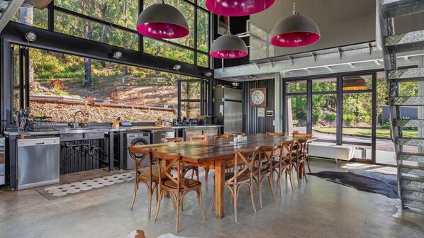 Downstairs - the open plan lounge-dining-kitchen area is enhanced with dual fireboxes, cathedral ceiling, stunning artwork and unique lighting. The retractable glass doors or oversized windows on all sides bring the outside in, and allow the air to freely circulate.