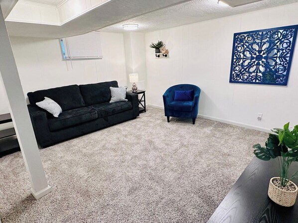 Welcome to our suburban haven, just minutes from the Chiefs and Royals stadiums. Recently renovated, this listing offers a cozy living room with a pull out couch, large TV and complementary Netflix.