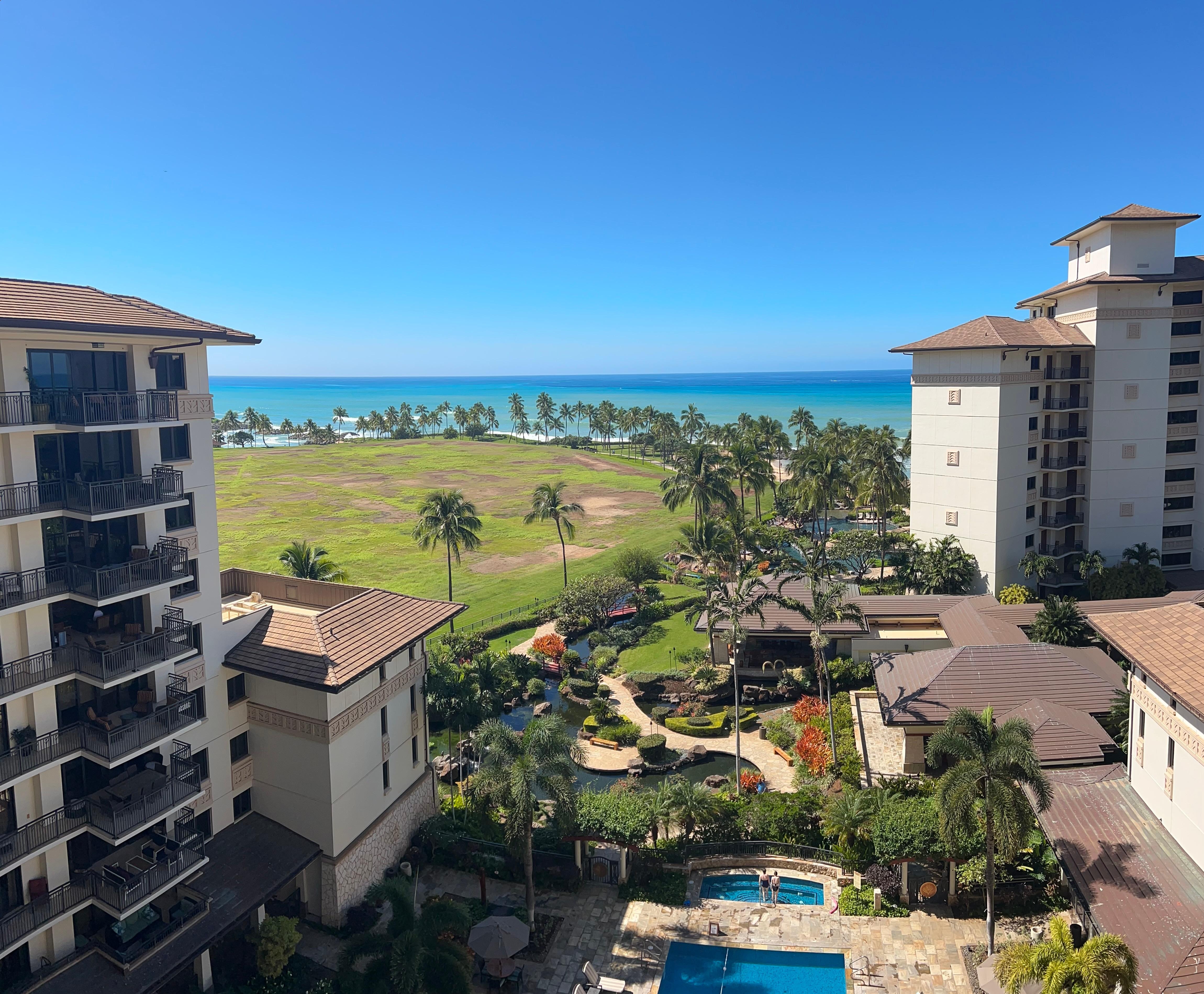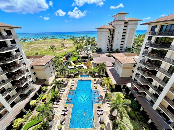 Unforgettable vacation home for your family and friends! Stay at home yet enjoy all the activities of paradise just out your front door! Unlimited activities for adults and the children. Snorkeling, swimming, sunbathing on four breathtaking white sand beach lagoons just outside your private gate. World class restaurants within walking distance of your home. You will stay in a 1,365 sq ft. 9th floor Ocean Tower Suite. Unforgettable vacation home for your family and friends! Stay at home yet enjoy all the activities of paradise just out your front door! You will stay in a 1,365 sq ft. 9th-floor Ocean Tower Suite. As you enter your home, you will have a panoramic view of the Pacific Ocean and a tranquil koi pond and pool area from the kitchen and living room. Only steps away from the white sandy beach where you are looking for and enjoy tropical trade winds. It is convenient for almost everything, like eating out, golfing, luau shows, and shopping. Enjoy two resort swimming pools, three jacuzzies, fitness center, BBQ grills, and a fully loaded fitness center with a sauna/steam room. Come to the beach bar for Ko Olina's famous sunset and enjoy your cocktails while experiencing the most memorable moments of your Hawaii trip. Your exclusive villa includes one parking stall and a semi-private elevator, taking you to your 9th-floor suite.