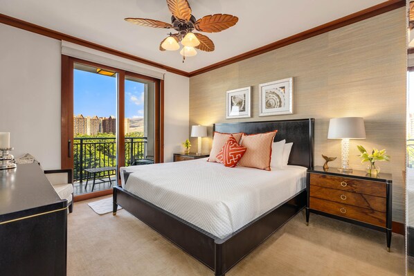 The spacious lanai is the heart of B604, offering comfortable seating and views over the treetops toward the ocean. Relax with morning coffee, enjoy cocktails at sunset, or simply listen to the waves below. With Ko Olina’s pristine lagoons just steps away, this villa embodies the effortless rhythm of resort living.