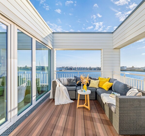 Den store takterrassen vil sikkert bli et av favorittstedene dine. Her har du en fantastisk utsikt over havnen og Ostseefjord Schlei. Nyt solnedgangen i fred, eller slapp av i den finske badstuen med dusj.