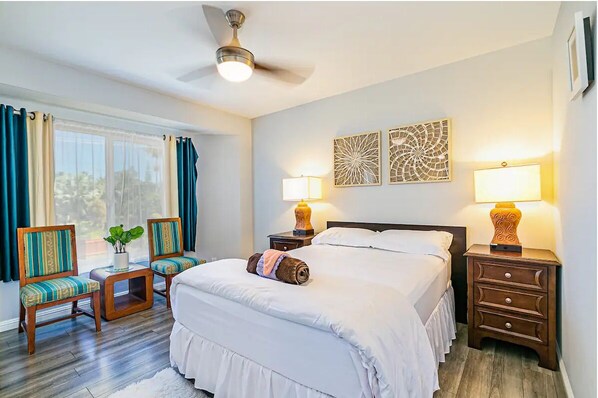 In addition to the king sized bed, the master bedroom features a twin pullout chair, and in the living room is a queen sleeper sofa; please note that we provide linens based on how many guests are on your reservation! The house is very private and quiet, with a large front lanai to survey the surrounding rainforest. The spacious modern kitchen, bedrooms, bathrooms, and gorgeous marble floors throughout are what we love about this house.