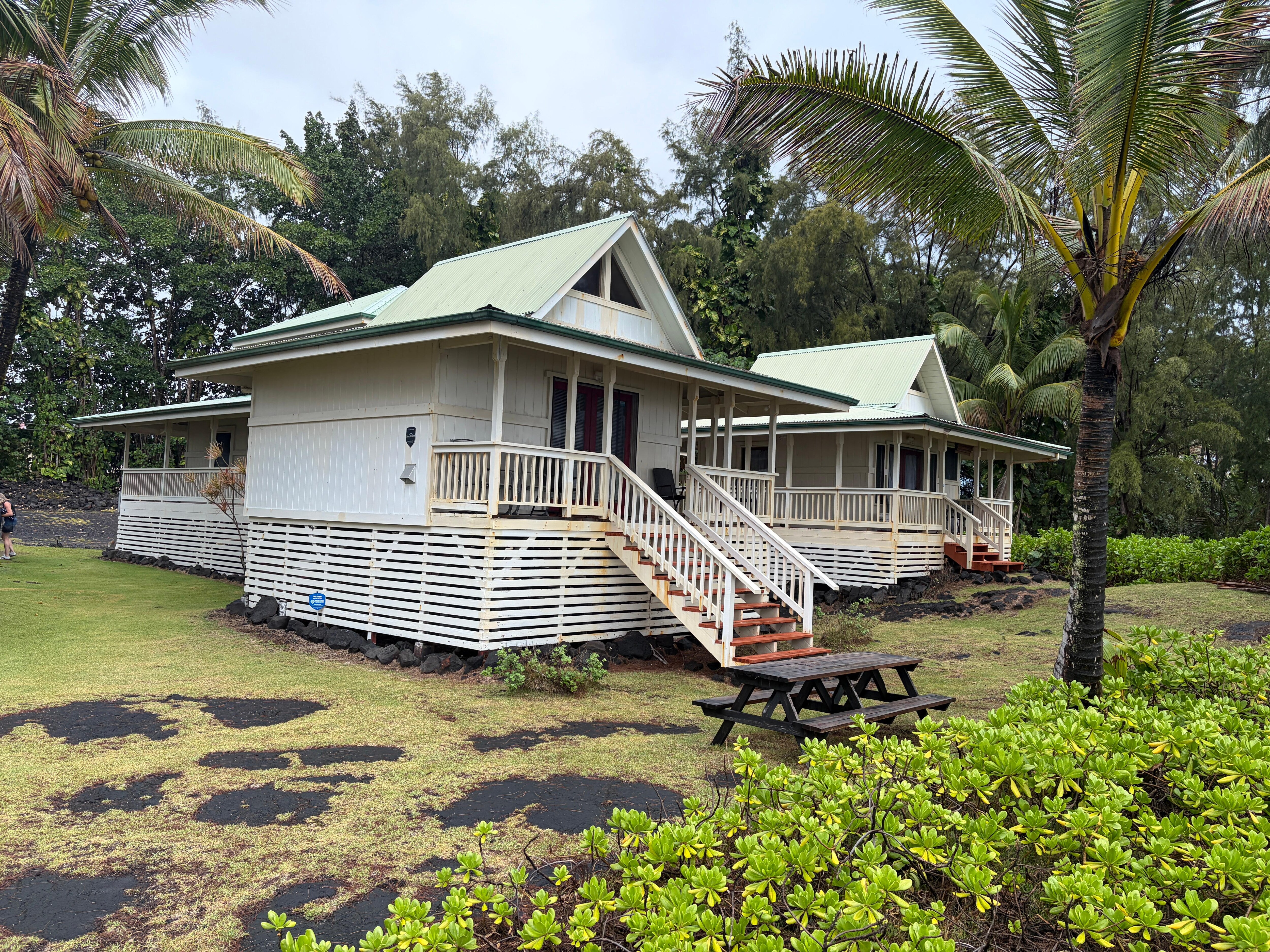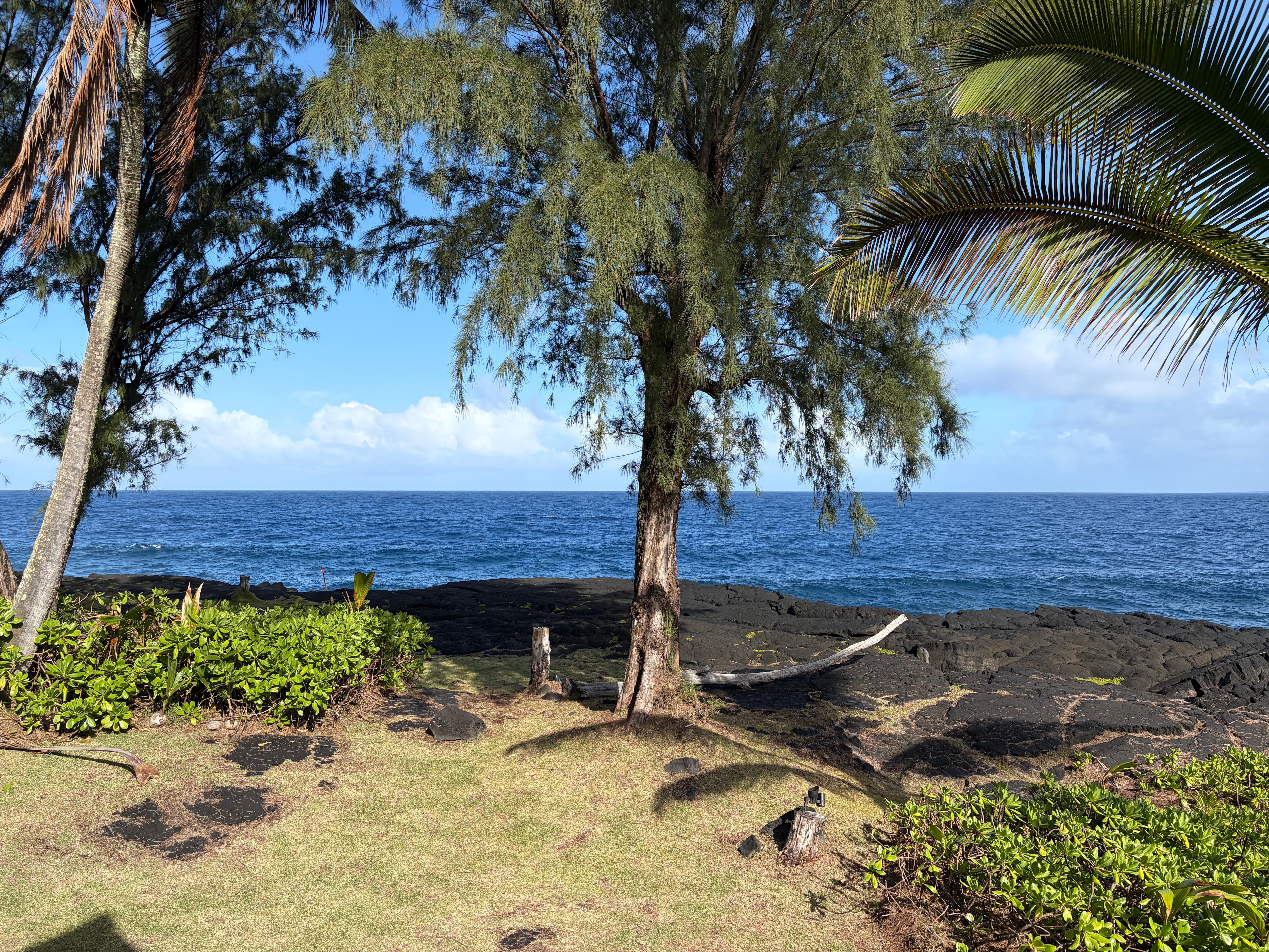 Overlooking ancient lava ocean cliffs, Temple Tree Retreat is designed to see and feel nature all around you. Our home has three main living spaces - you get the entire property to yourselves. The main area hosts the kitchen, two bedrooms, bathroom and laundry room. Another area is a bedroom/bathroom suite and the third area is a library and office space with a pull out couch bed. The three areas are connected by a covered, open lanai that serves as a cool gangway with amazing ocean views from every plank. Live the Adventurer's life, be a pirate for a week, explore this astounding island from your home port of Temple Tree Retreat.