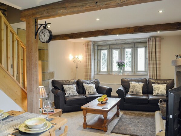 Stue / spisestue: Med trebrenner, 40 "Freeview-TV med YouView-boks og bjelker.