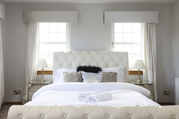The stunning living room in the Greenknowes Farmhouse also has three comfy sofas and a roaring fireplace, perfect for a cosy family game night! The TV room has 3 sofas and a TV with full Sky Sports Package and Sky Movies. The barroom has a pool table, a TV, a jukebox and a darts board to keep you entertained. The beautiful conservatory, overlooking the garden, has a corner sofa and a hanging egg chair.