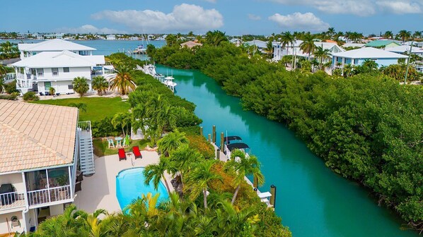 adventure. Featuring a sparkling heated pool, a private 50-foot dock, and an outdoor living