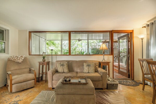 The inside of Ann Street Gardens starts with the living area that includes a wall of glass overlooking the patio. This and other oversized windows throughout fill the cottage with lovely filtered sunlight and views of tropical greenery. The conversation setting includes a deep couch that also serves as a pull-out full bed, an ottoman that doubles as a coffee table, end tables with lamps, and an overstuffed armchair. The opposite wall holds a large flat-screen TV perfectly placed for viewing from the couch or chair. Under that is a brightly painted hutch that adds color, an artistic touch, and storage space. At the end of the room you'll find a small dining table and two chairs nicely placed beside a wall of glass that give you a congenial view as you enjoy a meal here.