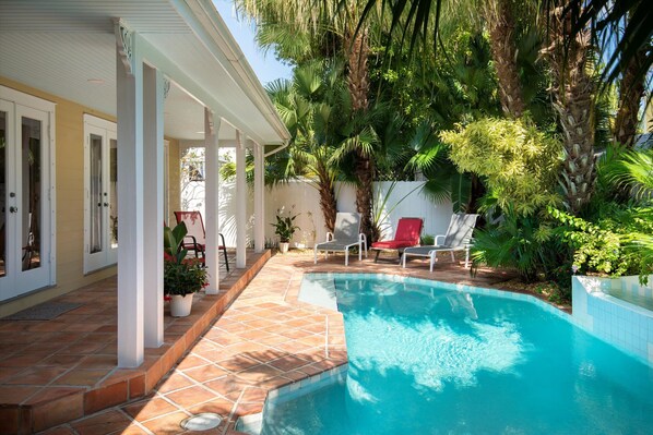 OUTDOORS: Refresh while listening to the waterfall and getting some sun floating in your large, very private, heated and chilled pool. Rinse in the outdoor shower. Enjoy the recently upgraded and well-maintained landscaping Visit with friends or read a book and listen to the rain on your fully-shaded, large, tiled patio. Play cards, at the shaded outdoor dining table and / or sip cool drinks from the nearby beverage refrigerator. Or, if you like, enjoy takeout from Paradise Café only a block away. Take walks through the gorgeous midtown west neighborhood or bike to beautiful Higgs or Smathers beaches only a 5 minute ride away.