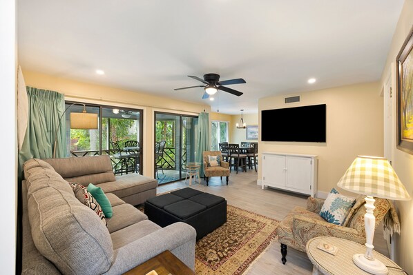Upon entering the villa, you'll notice the recent upgrades and inviting neutral colors. The living room has simple modern furnishings and is a comfortable place to unwind after a long beach day. Located just off of the living room through the sliding doors, the screened in porch is an idyllic spot to spend time, relaxing with a book, enjoying your morning coffee, or even dining outdoors with friends.