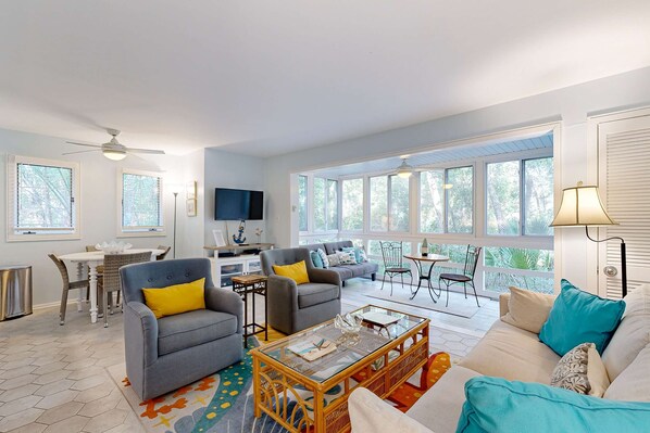As you enter this Seascape Villa, the master bedroom will be on your left and features a spacious king bed, television, and ample closet space. Access the updated bath via the bedroom, as well as the hall. The open living/dining area includes a table and seating for four, with the lovely sun porch located just off the living space. The living area has a sofa sleeper and television with a DVD player- a perfect place to enjoy a movie at the end of your day!