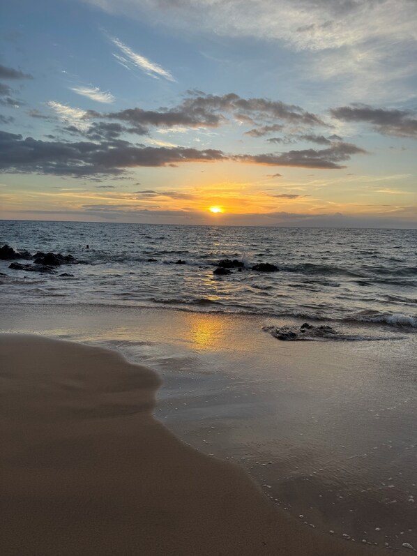 A 5-minute stroll from the pool brings you to one of the best beaches on the Island, Kamaole Beach III. You can bring the provided towels, chairs, umbrellas, coolers, boogie boards, snorkeling equipment for a day of sun tanning, swimming, and snorkeling. Bring your phone to take videos – it is common to have turtles sunning themselves on the slightly submersed lava rock or swimming amongst you in the surf which is typically mild to a little wild. On the bank above the beach, there are lifeguards on duty during the day, picnic and shaded grass areas, showers, washrooms, and a children’s playpark. Every evening hosts a fabulous sunset!