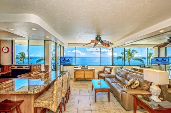 Amazing balcony and ocean-facing windows in every room (except bathroom). Views of Haleakalā summit, the ocean, and both sides of the bay. Loving coming home to geckos outside the front door every night. Would return again! Very quiet during the day and at night, aside from the crashing of waves. The volume and pattern of the waves was different every night, you are really right on the beach and the waves are wonderfully loud. Sandy beach for walking and swimming. Perfect location. 10-15 min drive to Kihei (grocery, restaurants), 10 minutes from the dock, 5 min to wildlife refuge, 1 min to convenience store. Top floor. Elevator down to pool/beach and parking. Well kept grounds. Air conditioning was excellent. The master bedroom has its own window-style unit, and the rest of the apartment has another such unit. We need AC to sleep and it got cool enough at night in both bedrooms. There are a few fans you can use & ceiling fans if you'd rather enjoy the fresh ocean air. Well stocked kitchen supplies, beach towels, cleaning supplies including vacuum. Everything perfectly clean. Mini laundry unit worked great.Good layout, pretty much anywhere you are you can see the ocean out a window. Bathroom layout is likely a little tight if you have a walker. Good shower with seat built in, but no handrails. Covered parking garage with elevator. Good communication from local site manager when we couldn't find the garage opener (which was obsolete).
