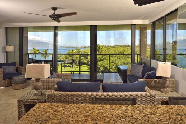 Fullt renovert og renovert, er vårt hjørne 2-roms, 2-bad Penthouse ganske enkelt nydelig. Stuen og Lanai har vakker, uhindret utsikt over Stillehavet og West Maui. Gjennom den lange veggen av vinduer som strekker seg fra kjøkkenet til stuen har du en fantastisk utsikt over Haleakala, Mauis høyeste fjell. Med den fantastiske 270 ° utsikten kan både soloppgang og solnedgang bli satt pris på.