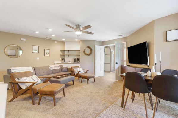 Back inside, the home is decorated with modern, and neutral decor. The living room has a comfy oversized sofa that doubles as a sleeper, a smart TV and a spacious private deck with gorgeous lake views.