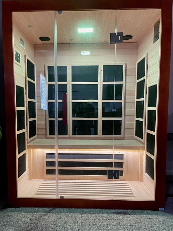 This private Spa Studio is designed for ultimate relaxation, featuring an in-room sauna, a two-person jacuzzi, a full-body massage chair, and a flat-screen TV—all for your exclusive use. Enjoy free WiFi and private parking on-site. Just steps from your door, a scenic path leads to the stunning Table Rock Lake, perfect for sunbathing or water activities.