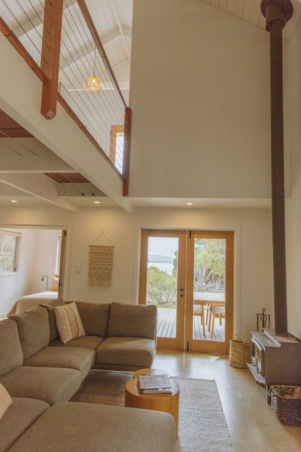 The open plan living room with oversized couch and wood fireplace is the perfect spot to relax in front of the tv after a day of exploring the island. Netflix and local tv stations are available on both tvs in the property along with free wifi access. A complimentary stack of firewood, firelighters and matches are provided for your stay.
