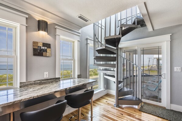 En slående spiraltrapp fører deg fra stuen til Ship's Watch som står 40 meter høyt over resten av øya, hvor du kan glede deg over å se hvaler, delfiner og strandgjengere når du fanger de søte havbrisene som blåser fra Atlanterhavet. Et flott sted å nyte morgen soloppgang eller bare ligge tilbake og slappe av å lytte til bølgene krasjer bare føtter unna.