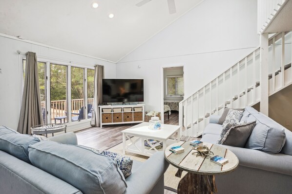 The House of Friends welcomes you with its tranquil hues of blue, echoing the serene ambiance of a coastal retreat. The spacious living area boasts plush sofas and a state-of-the-art TV setup, perfect for leisurely evenings after sun-soaked adventures. An elegant staircase rises to an inviting loft, offering an added layer of privacy and charm. The room's tasteful beach-themed accents, paired with expansive windows that drench the space in natural light, ensure that relaxation is at the forefront of your stay. Whether you're sipping morning coffee or gathering for evening chats, this home promises unforgettable moments of comfort and connection.