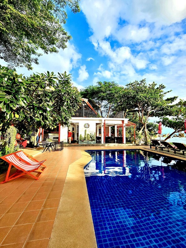 Hotell ved stranden med utendørsbasseng og hvit sandstrand