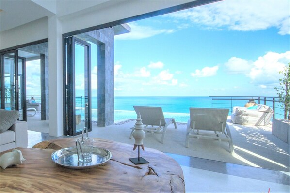 With direct access from the car park, the living room is the main living room, with a dining area, a lounge, the kitchen. It opens onto the terrace with its large infinity pool. The terrace is equipped with sun loungers, beans bags and a barbecue.
