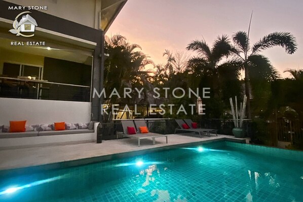 From large villa's terrace area, you would enjoy private pool area which comes with long sofa seats and outdoor shower. The pool is surrounded by various large plants and trees so you will feel fresh and peaceful throughout your stay. Villa has private free parking at the front of entrance with roof cover, the area is capable of parking 1 car with a few scooters. The road to the villa, which is a flat street, is easy to access by car or scooters and not too steep. You will be able to use the washing machine in the laundry room which is located on the lower floor from the main floor.