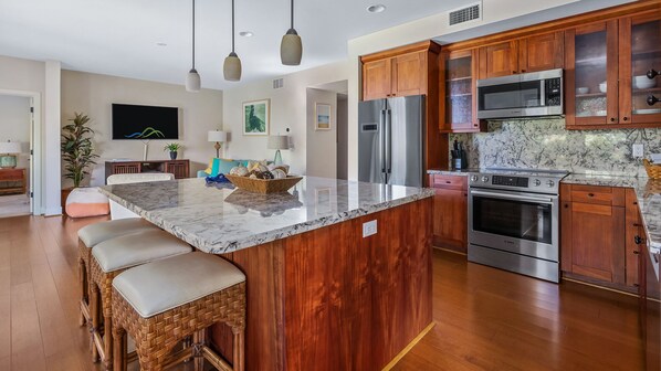 • Fully equipped kitchen with granite counters and stainless gourmet appliances